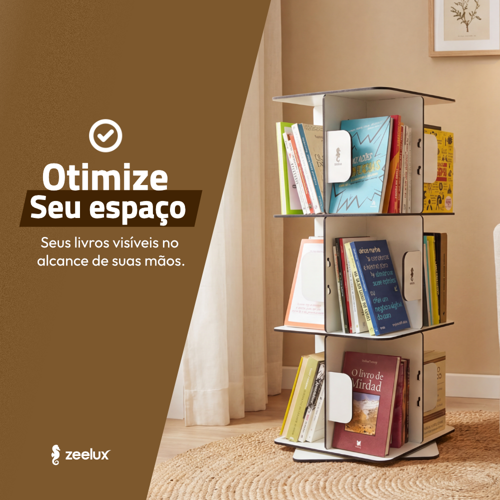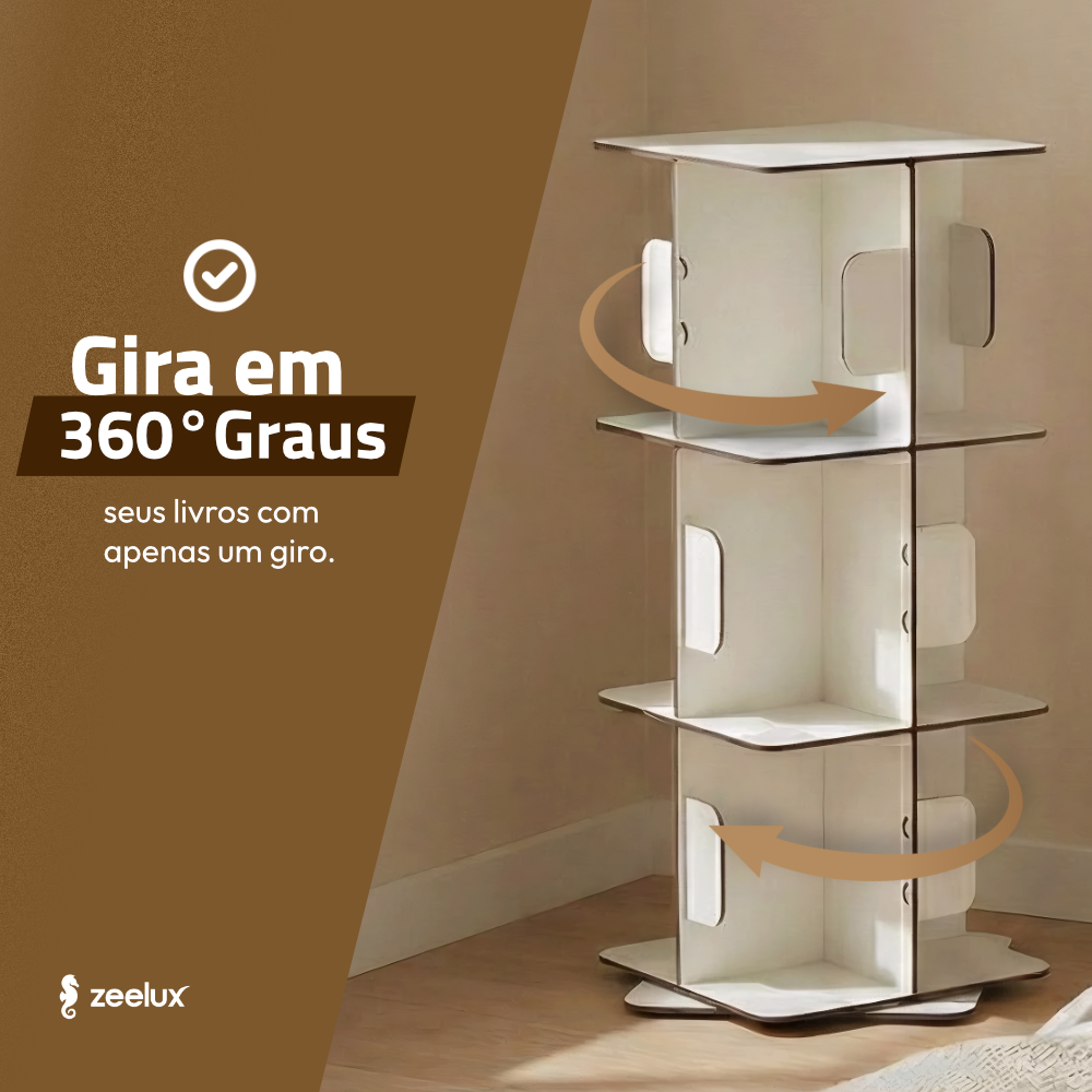 Sistema Giratório 360° – Acesso fácil e rápido aos seus livros, sem esforço. Basta um simples giro para encontrar o título desejado.